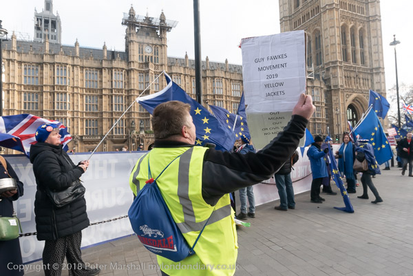a man holds a poster 'Guy Fawkes Movement 2019 Yellow Jackets' and