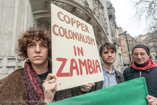 holding posters about Konkola Copper Mines, owned by Vedanta, who