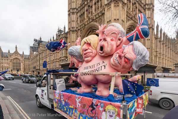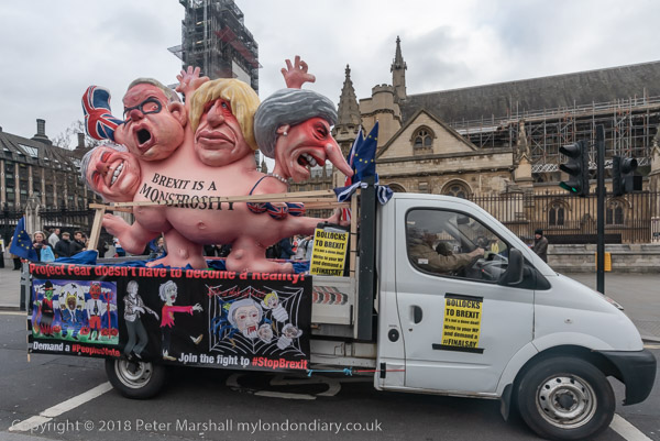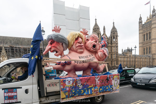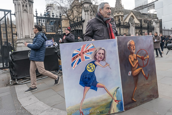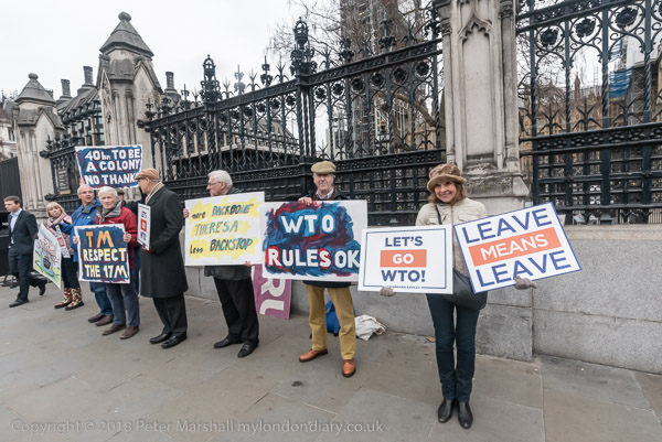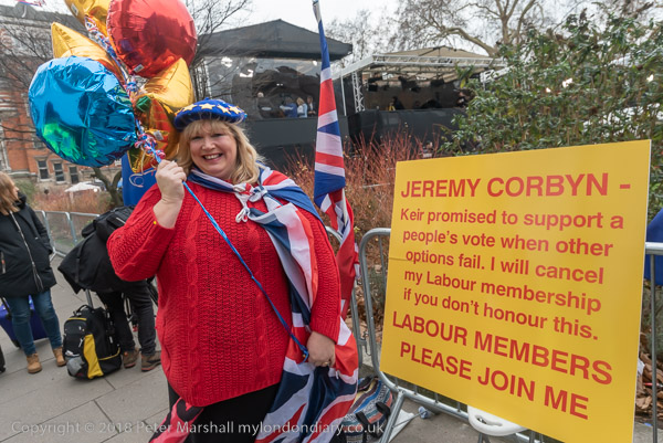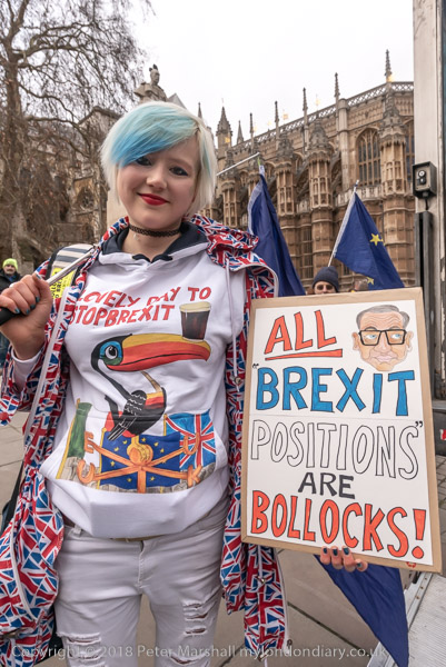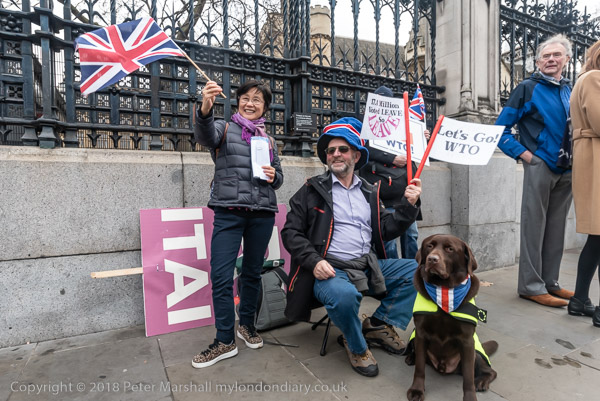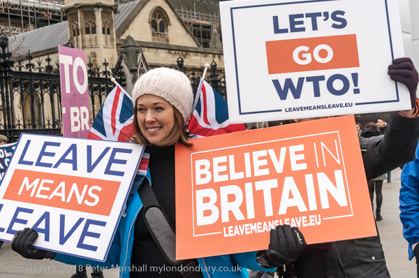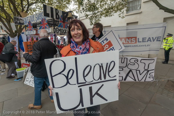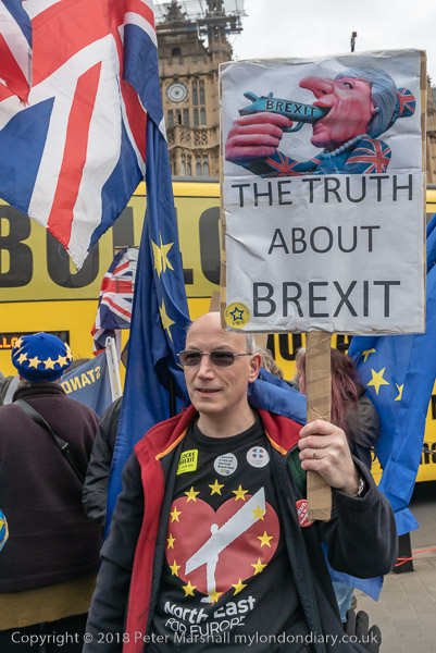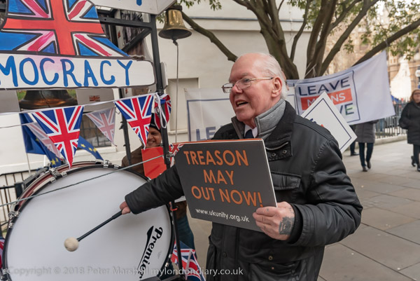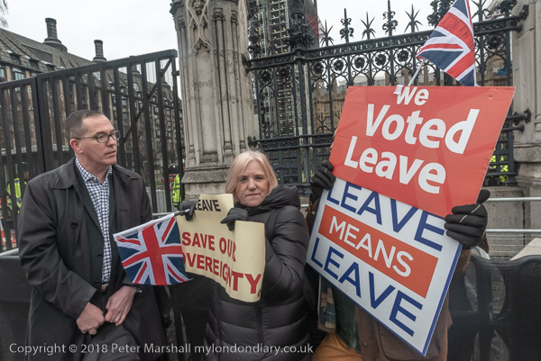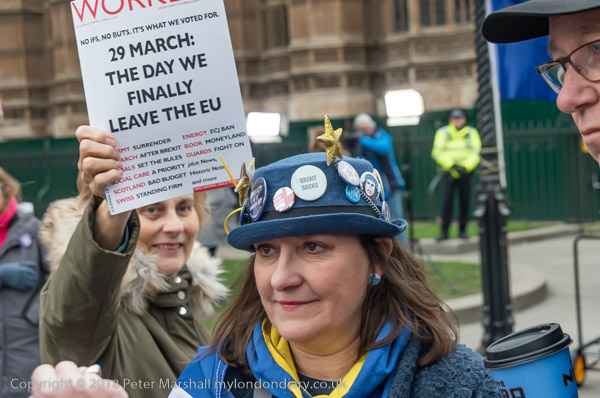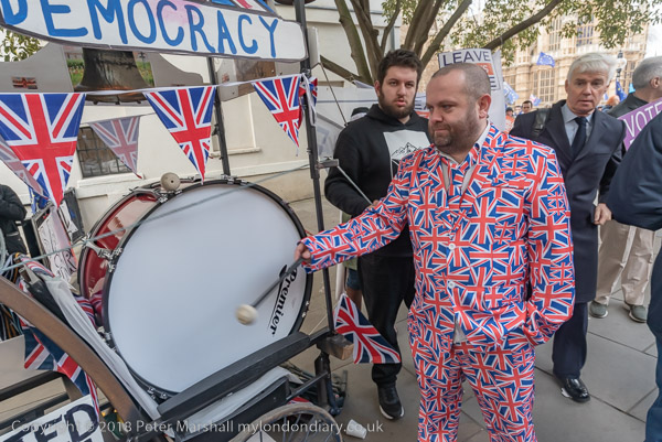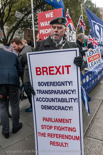 Someone holds up a call for a hard Brexit as he sees me photographing