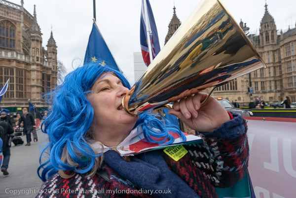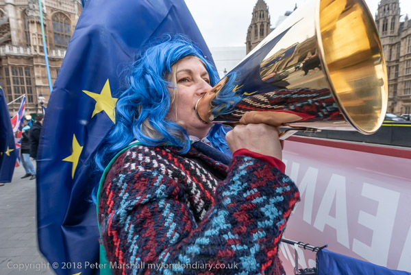A campaigner with a megaphone calls for a stop to Brexit. Electrical