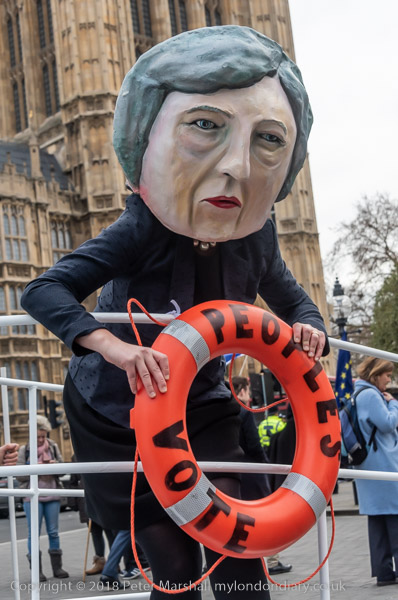 A woman wearing a Theresa May head mask stands in 'HMS Brexit' clutching
