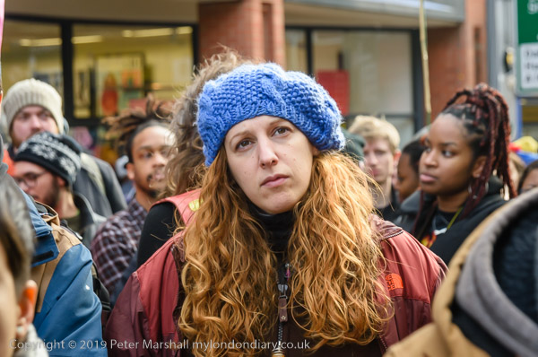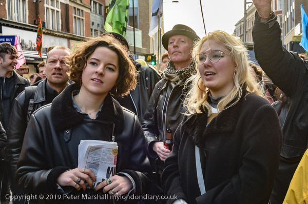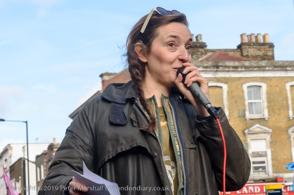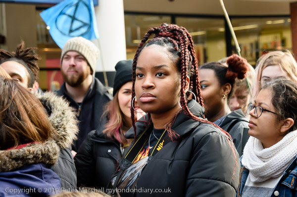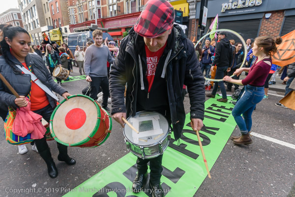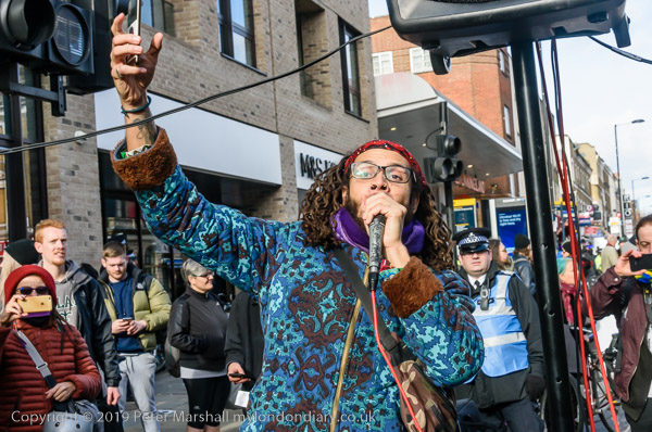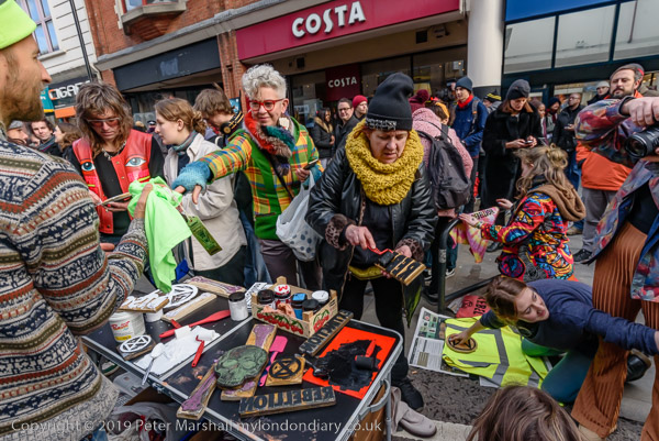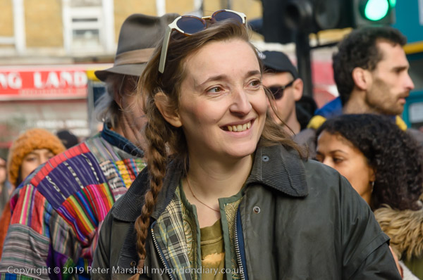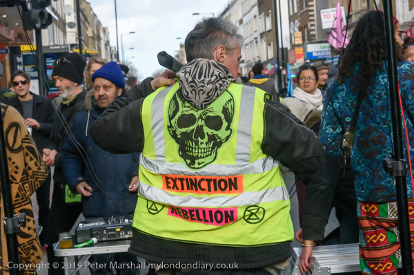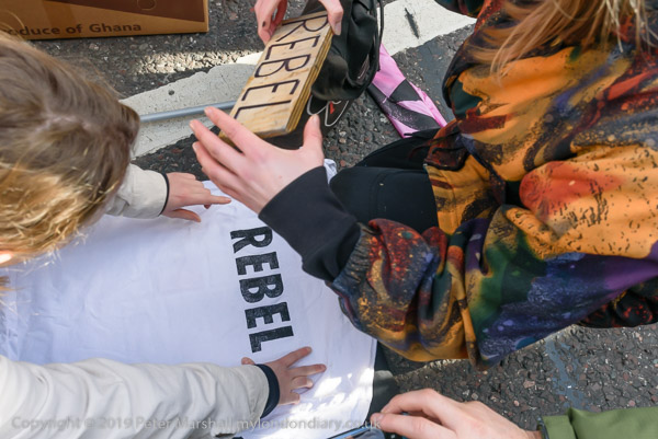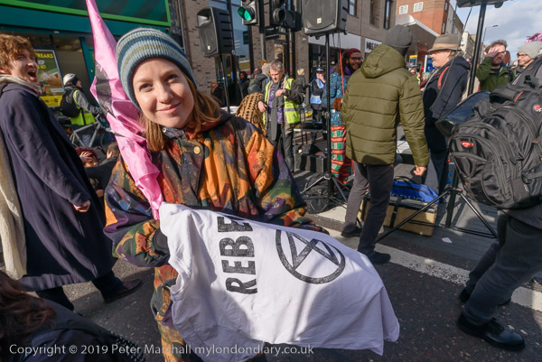 A woman holds a t-shirt printed at the Extinction Rebellion street