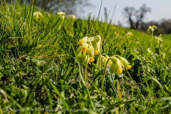 clumps of cowslips in bloom, before walking back to where the car was parked