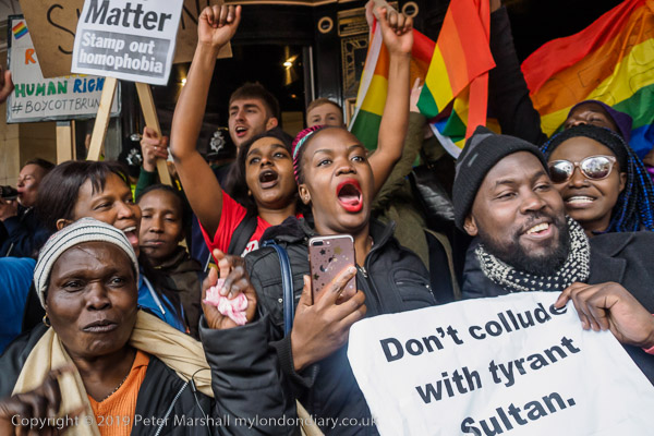 People protested outside the Dorchester Hotel in Mayfair against the multi-billionaire Sultan of Brunei who has announced death by stoning as a punishment for gay sex, adultery and blasphemy.