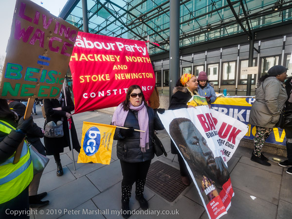 Campaigners at the government department for Business, Energy and Industrial Strategy (BEIS) show solidarity with catering workers at the end of their three day strike for a living wage and decent terms and conditions.