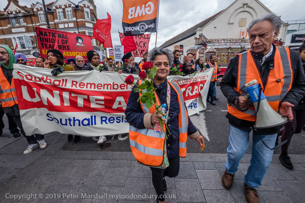 People marched in Southall remembering the murders there of Gurdip Singh Chaggar and Blair Peach, calling for unity against racism.