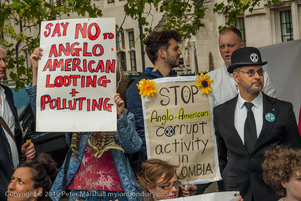 They protested against its disregard for human rights, the environmental devastation caused by its projects, and its neo-colonial policies in Colombia, Brazil, Peru, Chile, South Africa and elsewhere. Some protesters were shareholders and went inside to ask questions at the AGM.