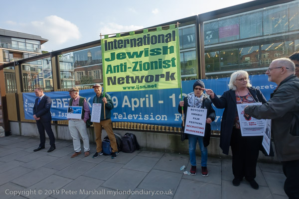 with International Jewish Anti-Zionist Network banner outside JW3Protesters, many Jewish, picketed the JW3 Jewish Community Centre on the Finchley Road which was hosting a fundraiser to recruit young people to the Israeli army.