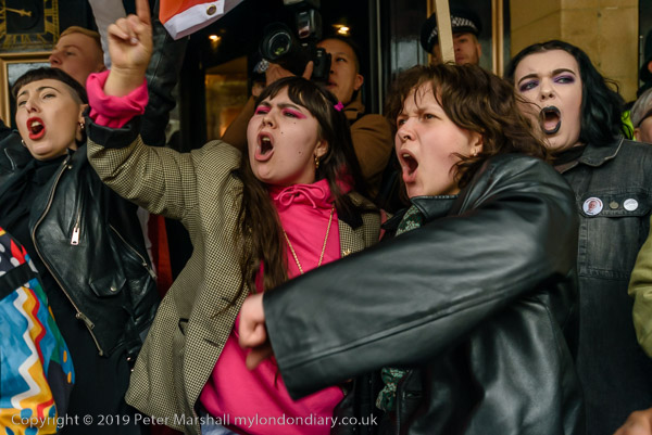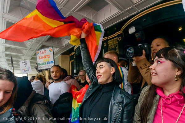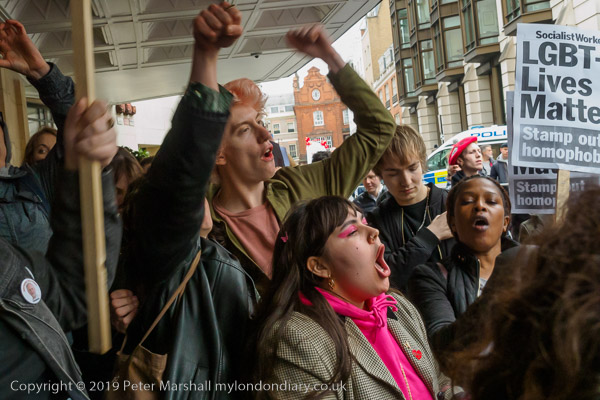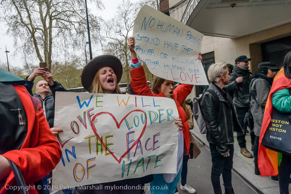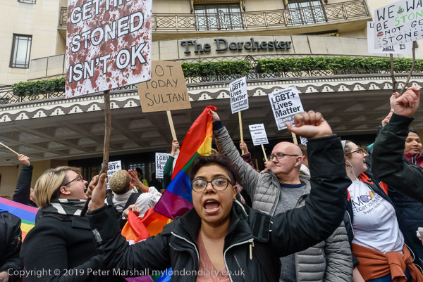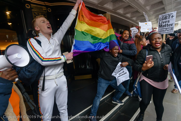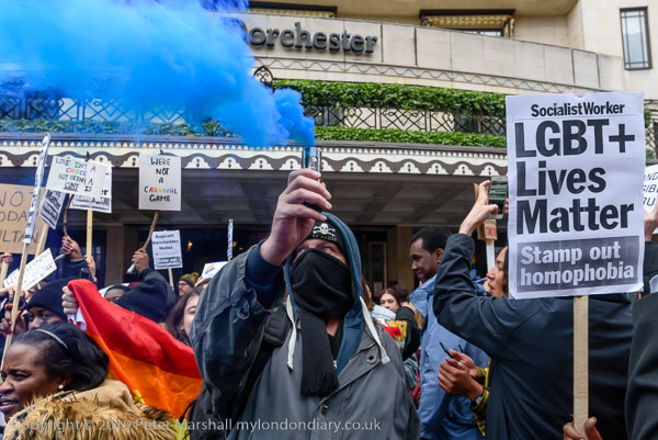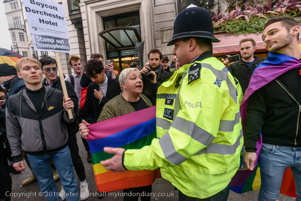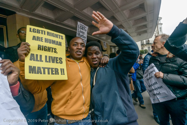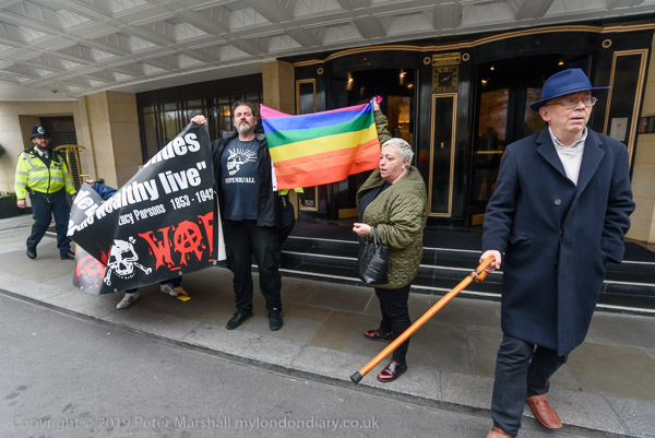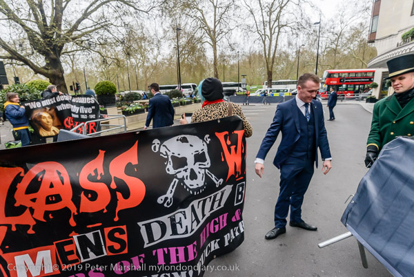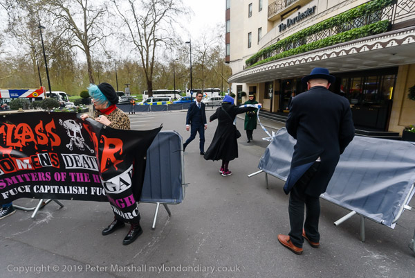 and protest in front of the main entrance to the Dorchester Hotel