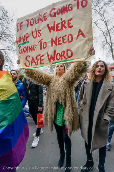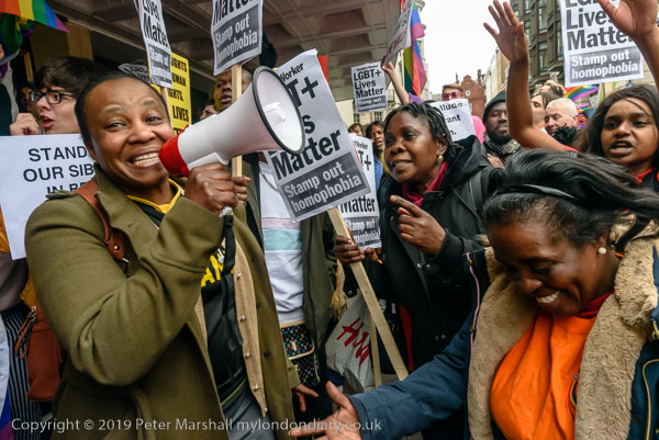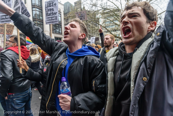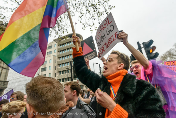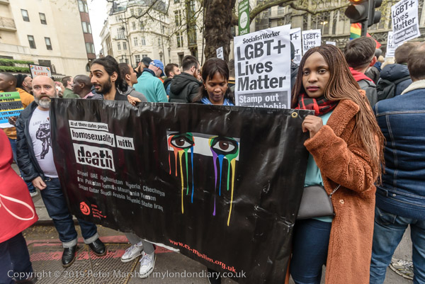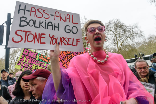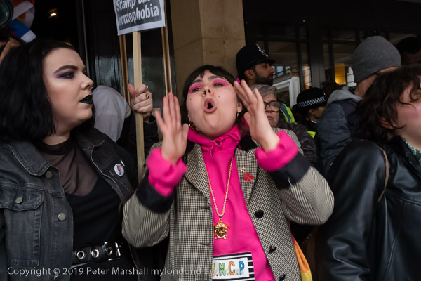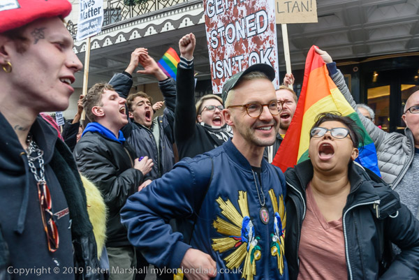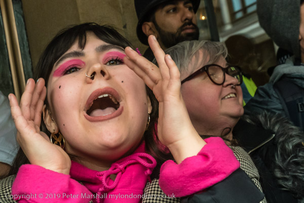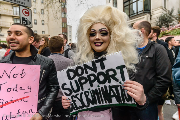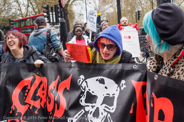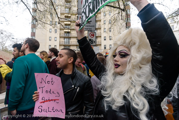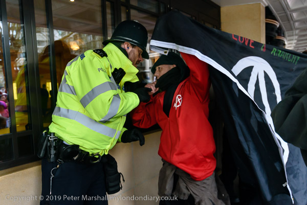 and protest in front of the main entrance to the Dorchester Hotel