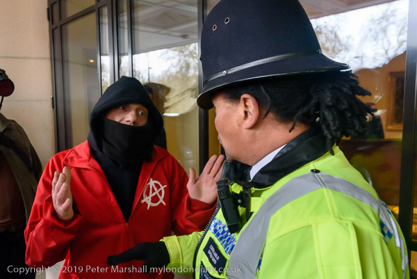 A police officer argues with an anarchist protester