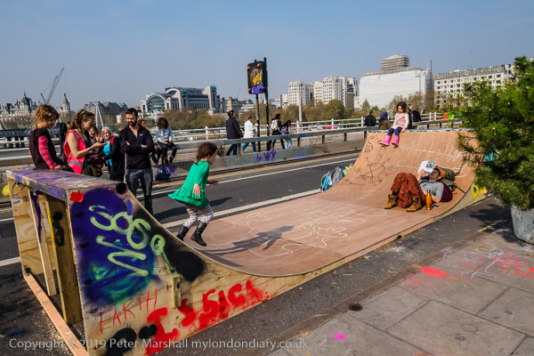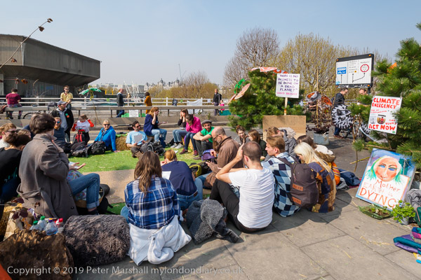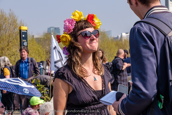 A journalist interviews one of the campaigners on the bridge
