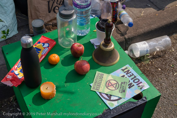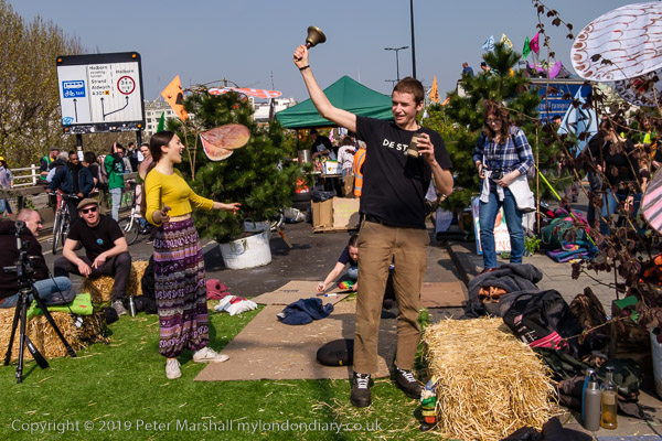 A bell rings to summon new protesters to an induction session