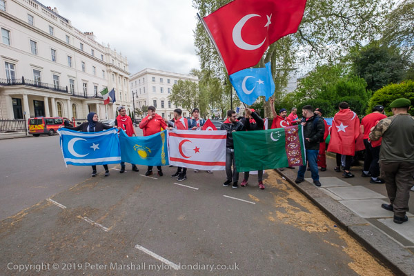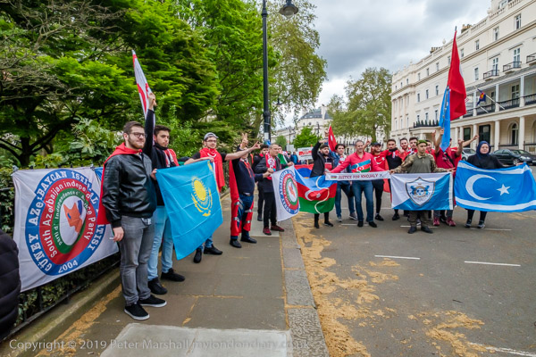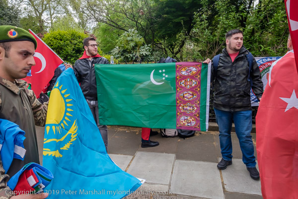 The blue flag with a yellow sun is for Kazakhstan and the green one
