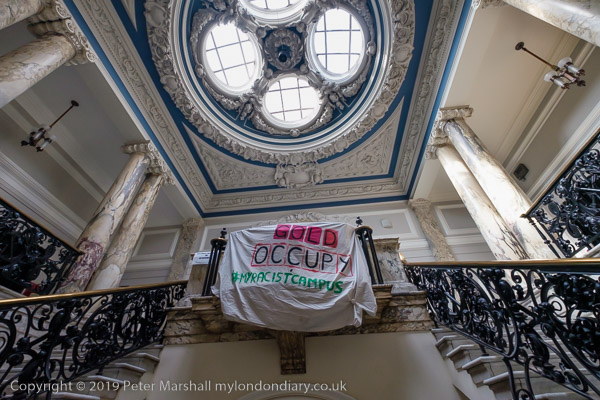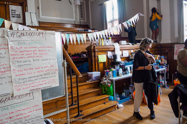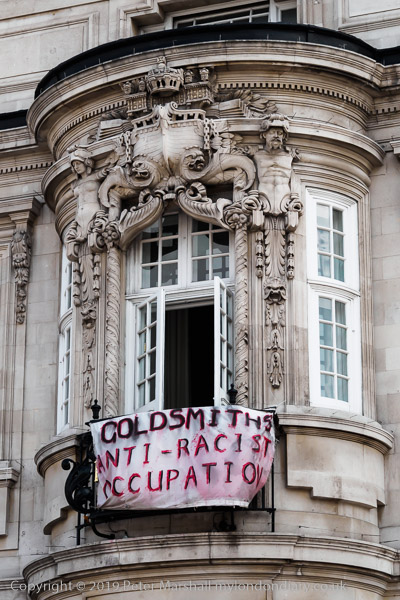 exploitation of the British Empire. Banners say 'Goldsmiths Anti-Racist