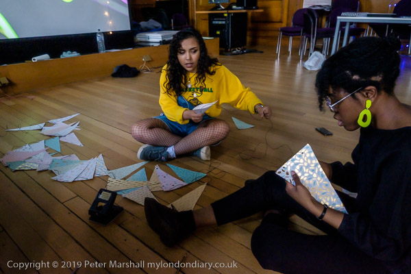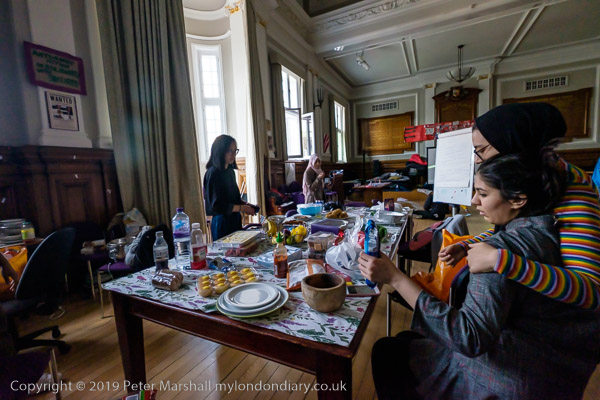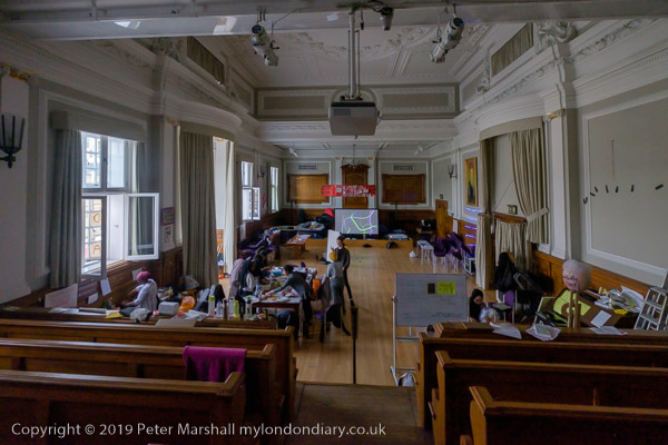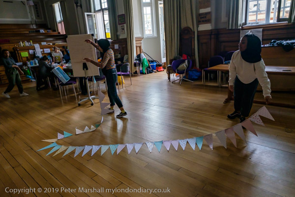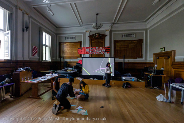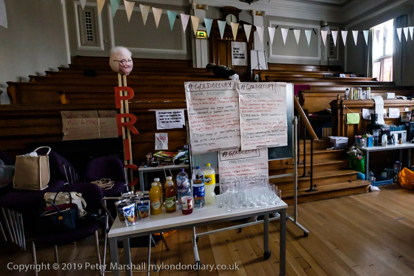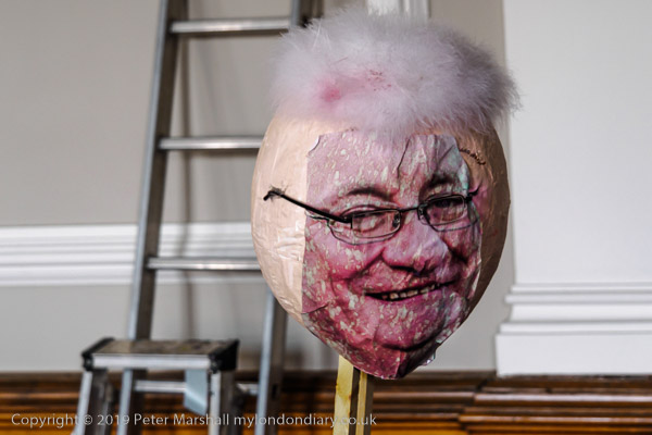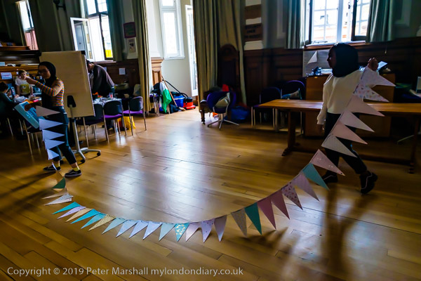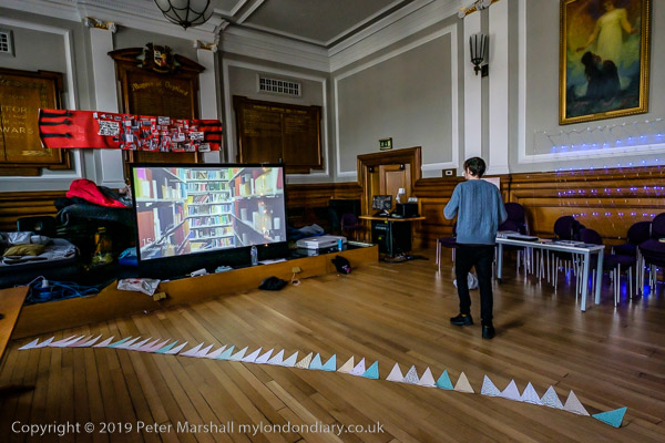 inside the Council Chanber people are making bunting for the party