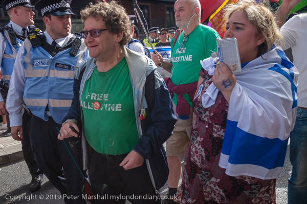 The march is briefly halted by Zionist protesters, but police move