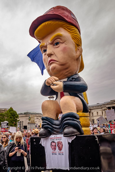 A giant Trump sits on a toilet in Trafalgar Square