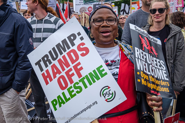 'Trump: Hands Off Palestine' PSC placard