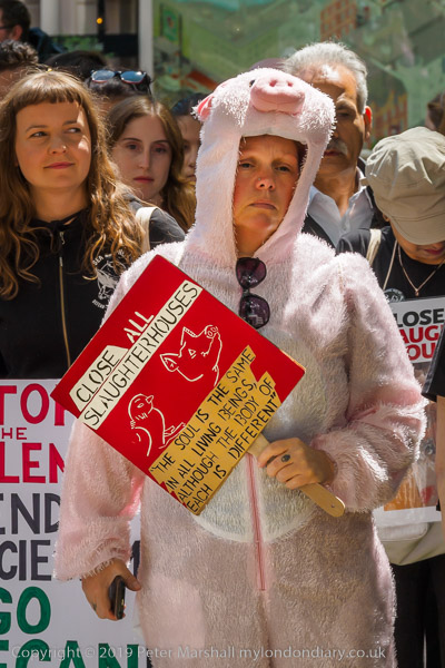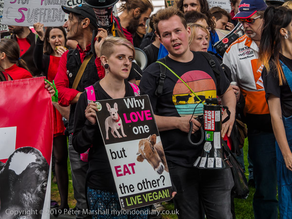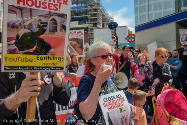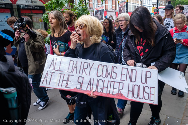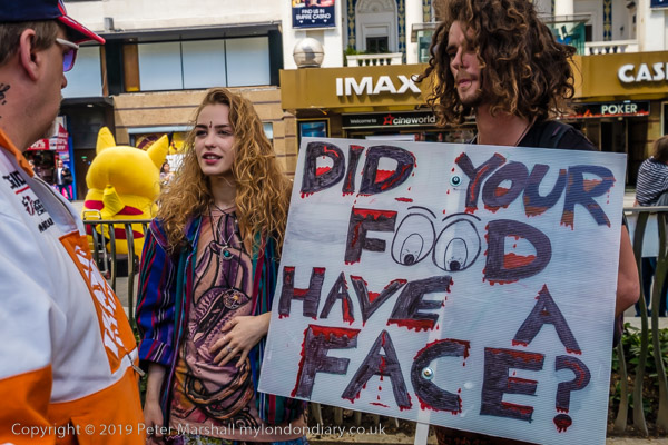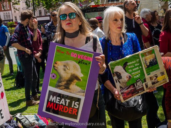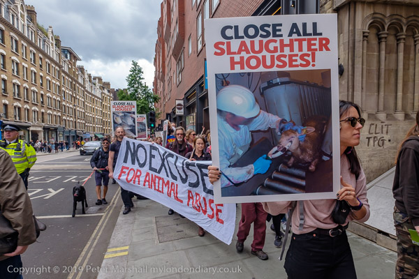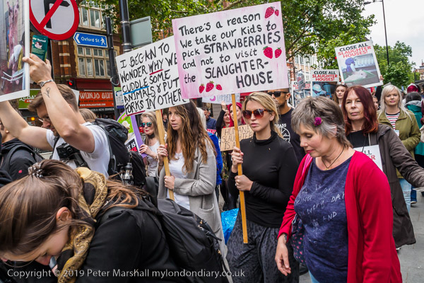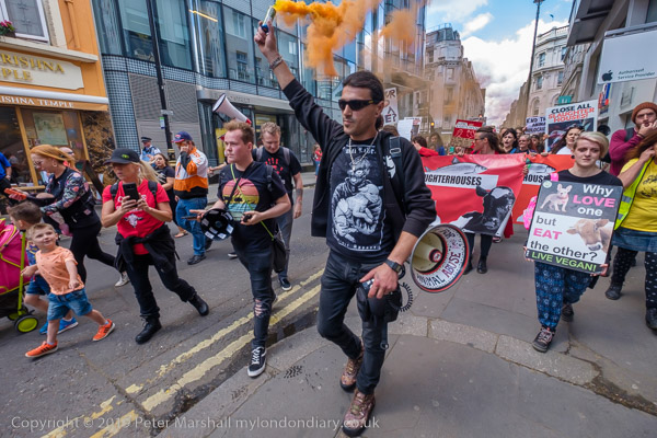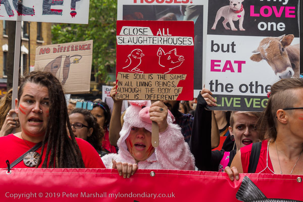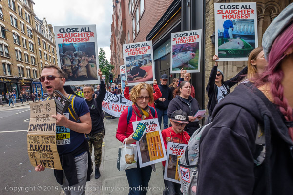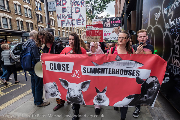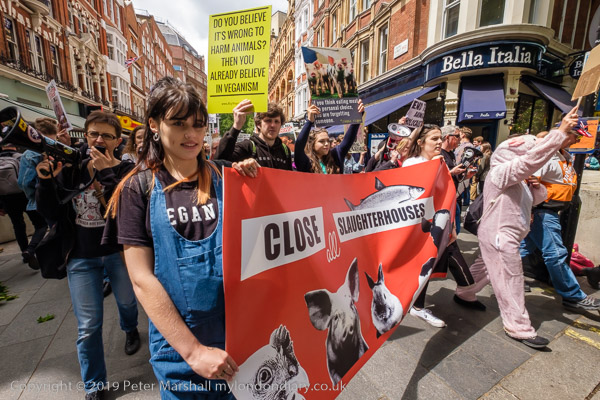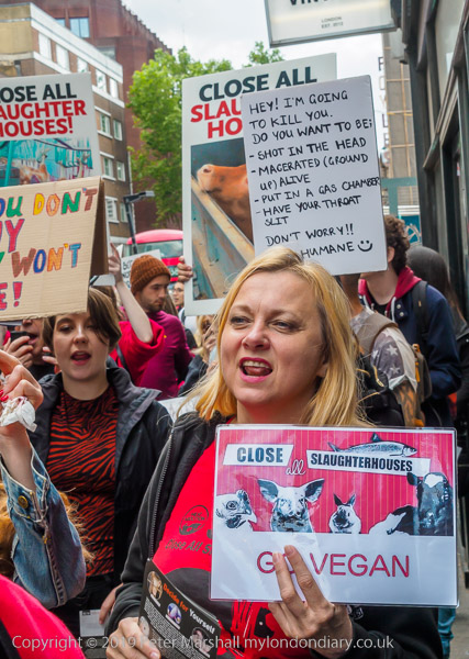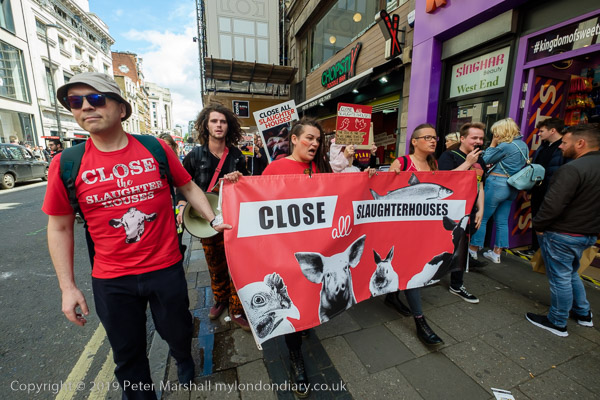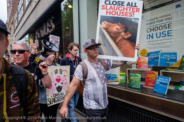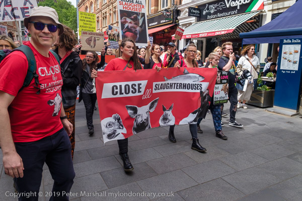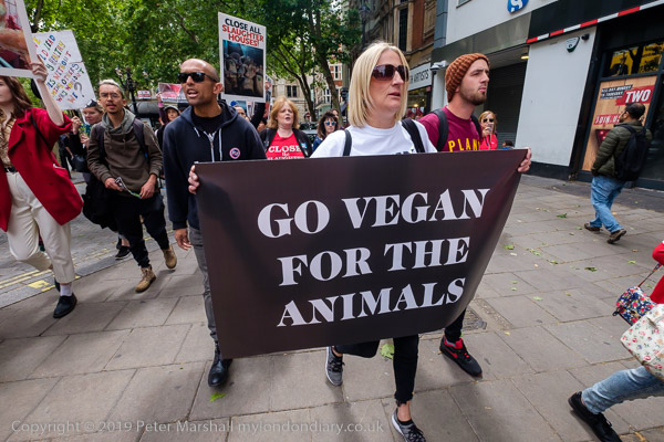 and goes up the Charing Cross Road. 'Go Vegan for the Animals' . But