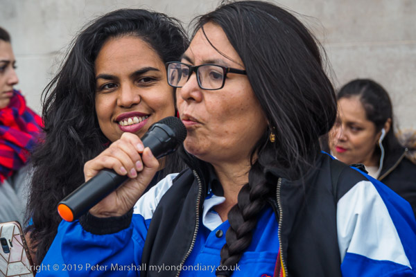 Claudia holds an indigenous flag, the Qullasuyu Wiphala