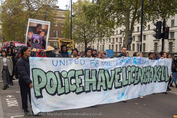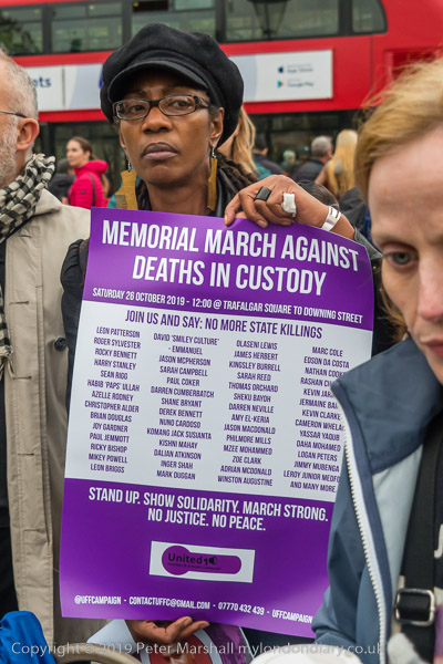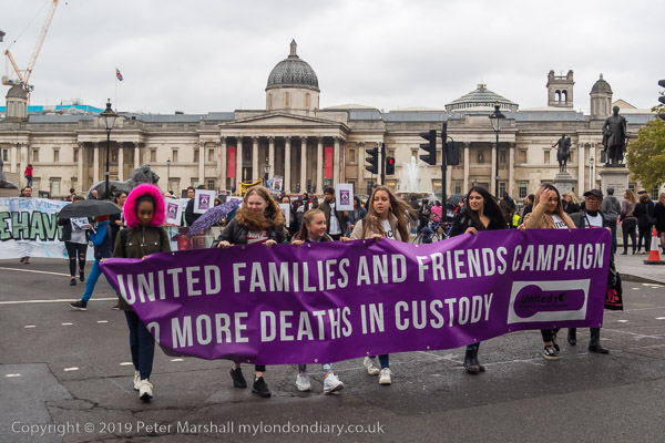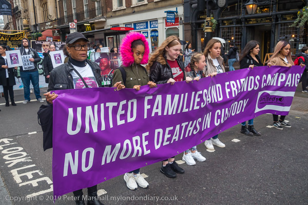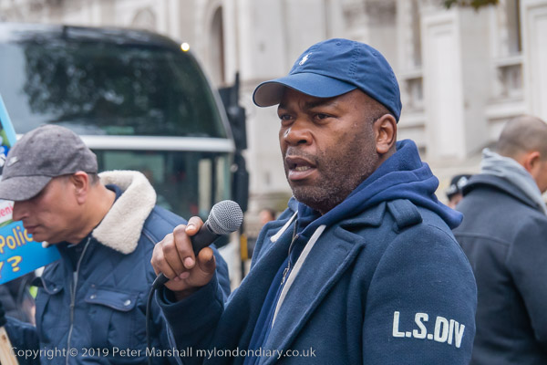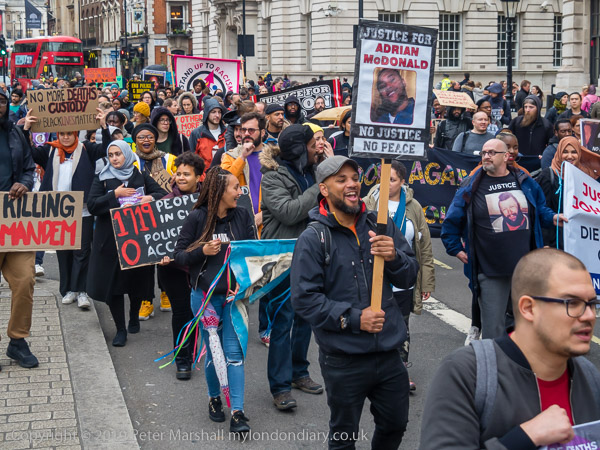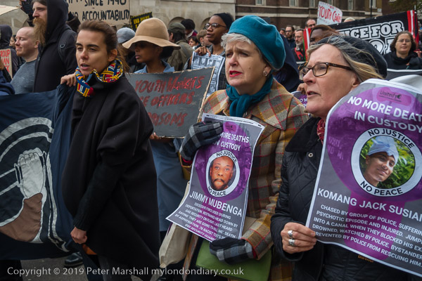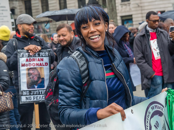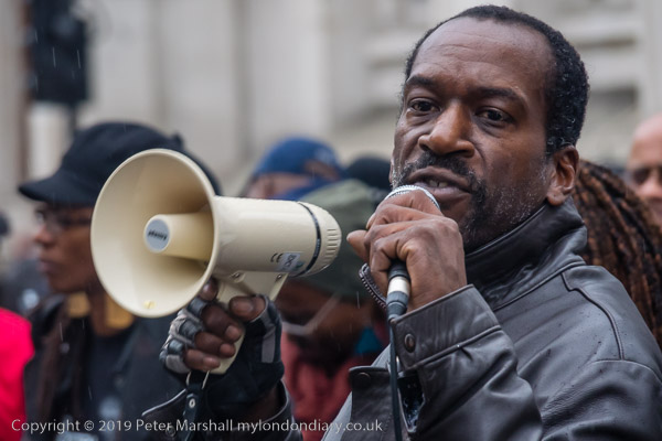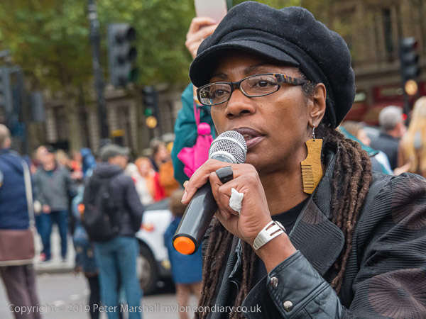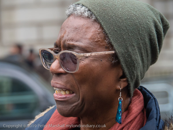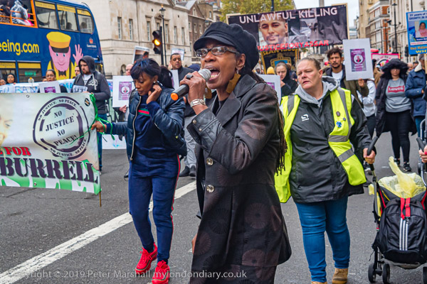 Marcia Rigg leads the chanting as the march goes down Whitehall; "Who