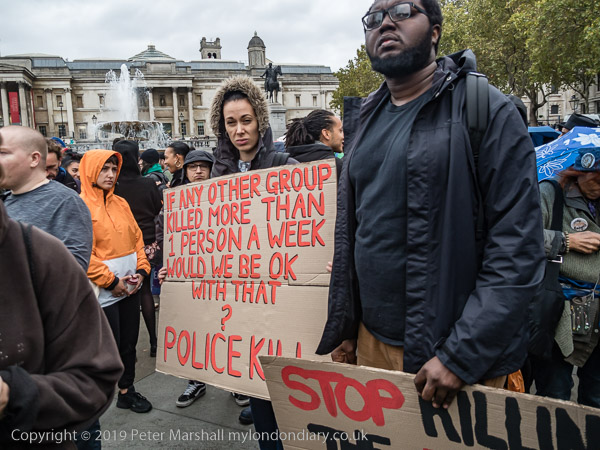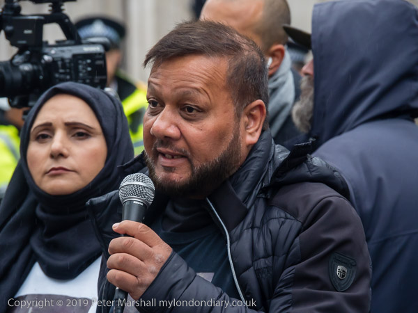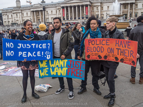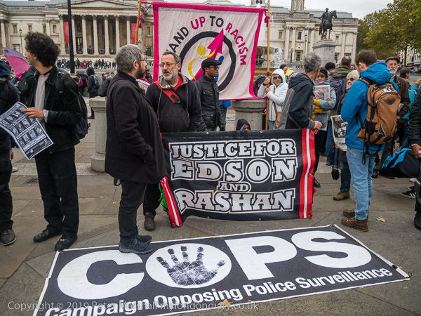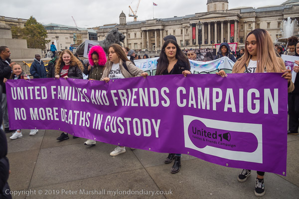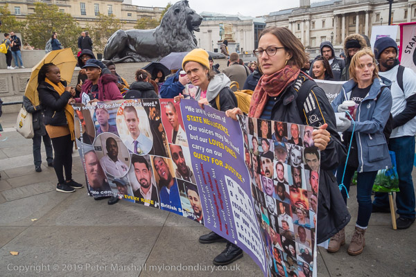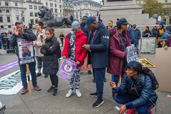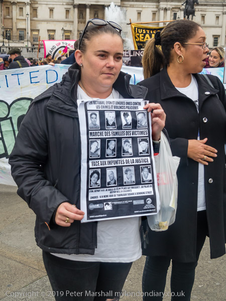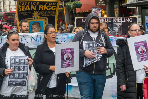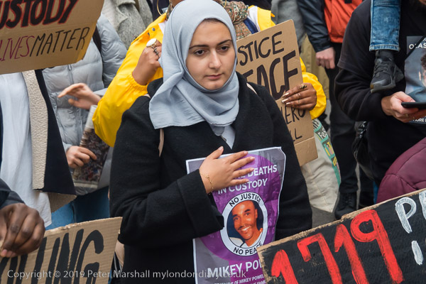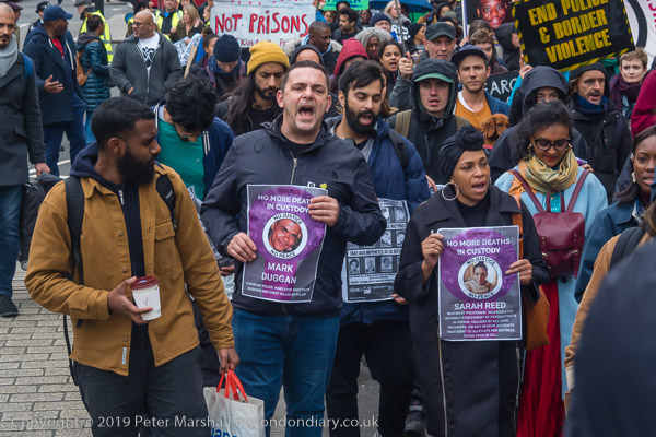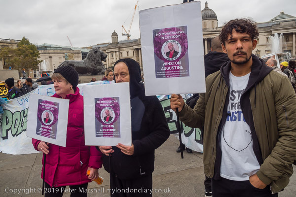 Marcia Rigg leads the chanting as the march goes down Whitehall; "Who