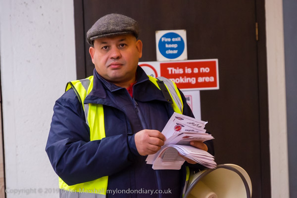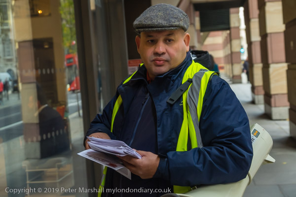 Alberto hands out fliers inside the WeWork offices with his megaphone