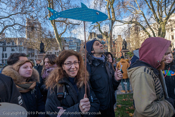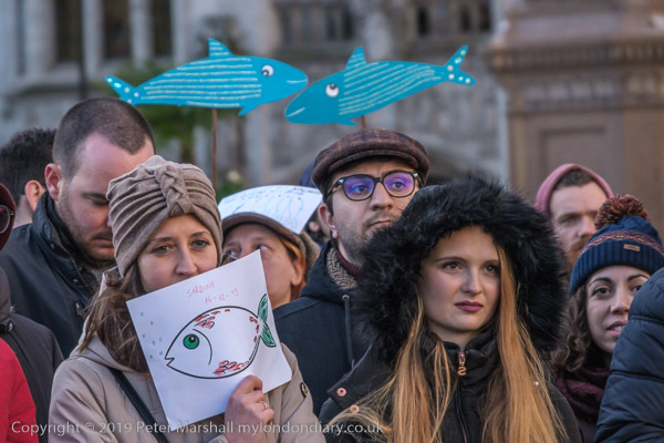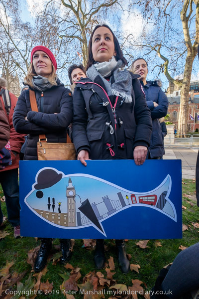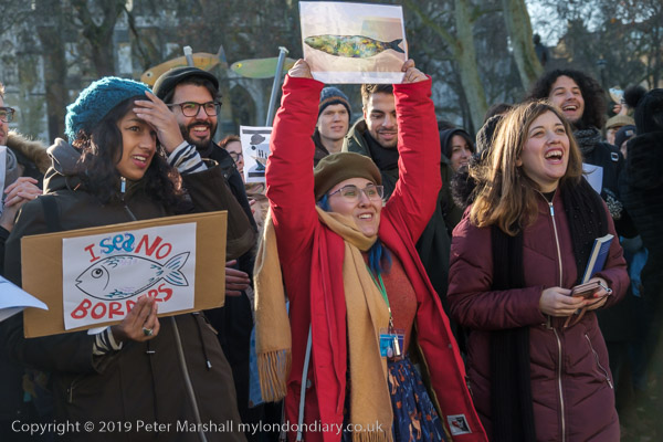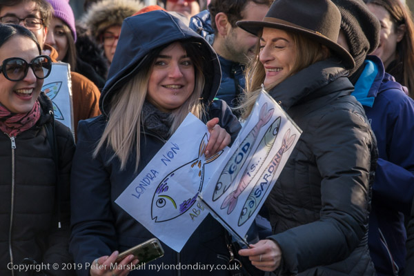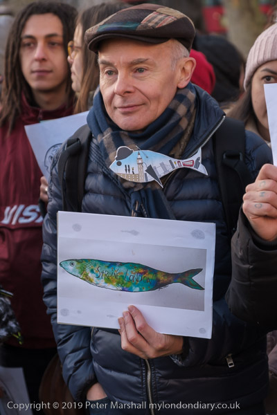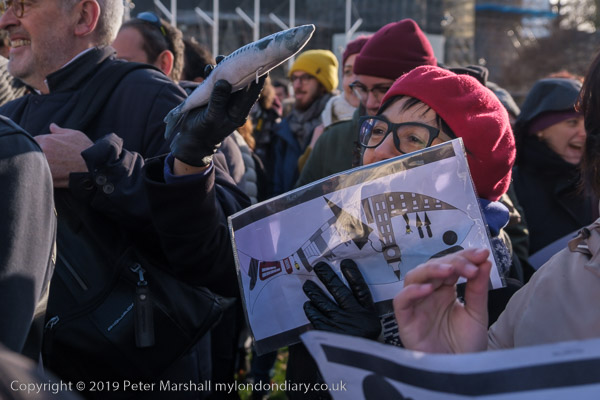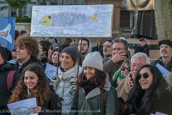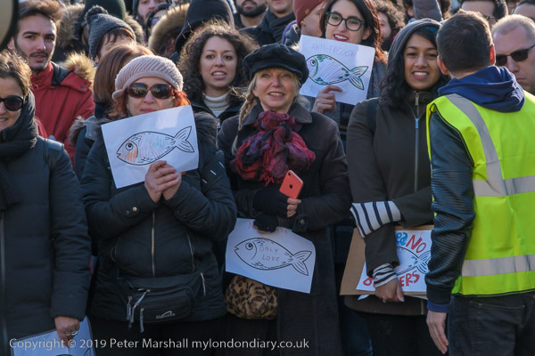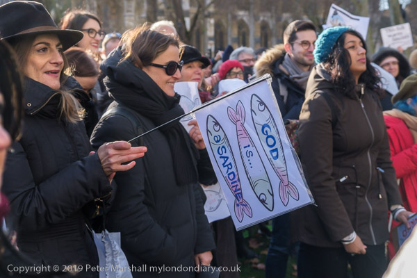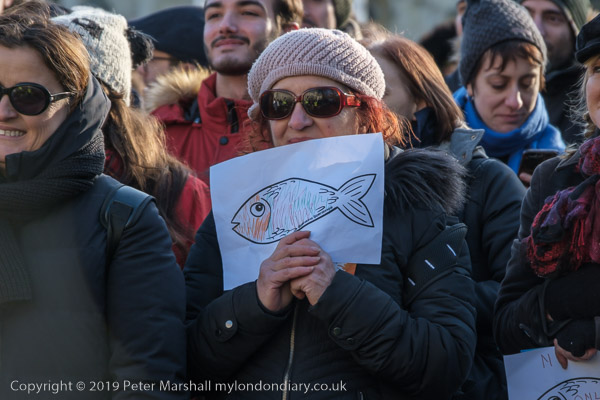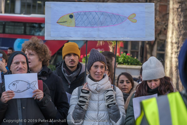 and one woman had three sardines on her placard with the message 'God