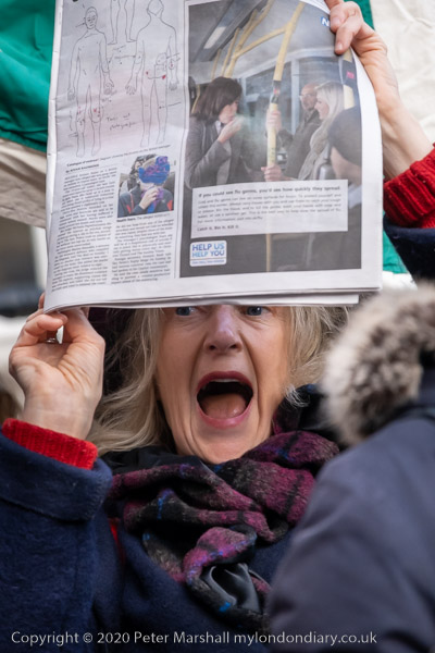 A woman shouts and holds up a newspaper with diagrams showing '35