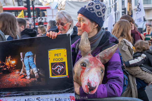 A woman holds a bloody kangaroo head and calls for an end to killing