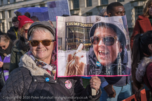 A woman holds a placard with a photograph of her giving the finger at Trump Tower