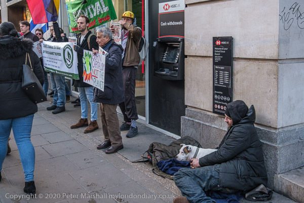 A man sits with his dog outside the bank and listens to the protest. One of London's many homeless