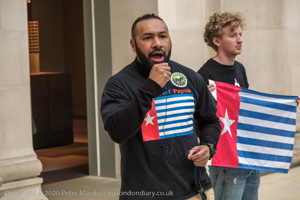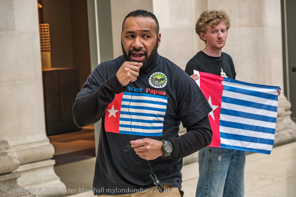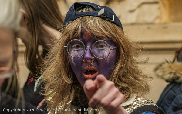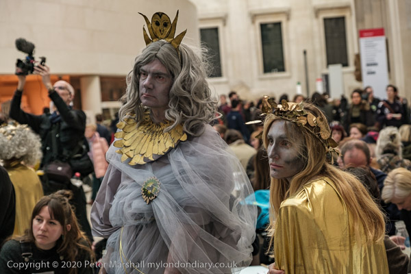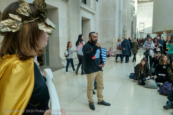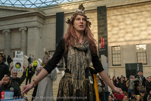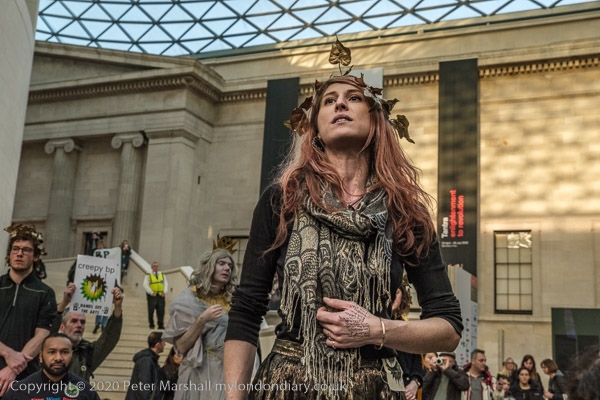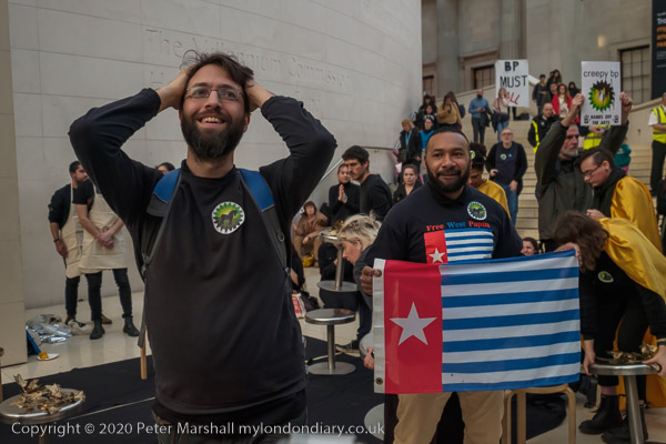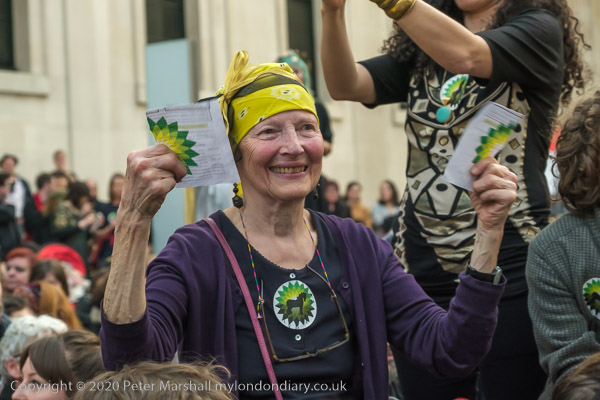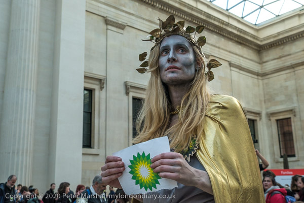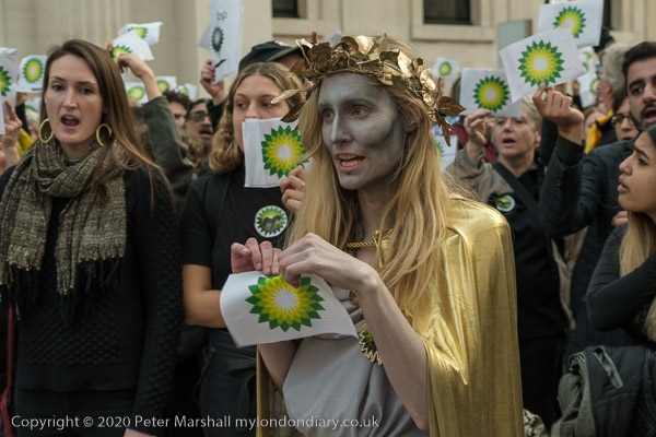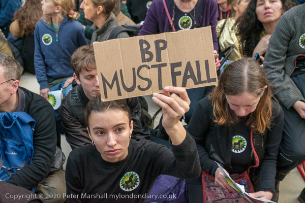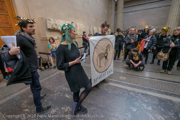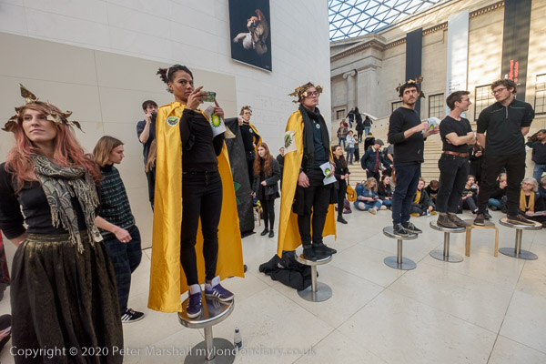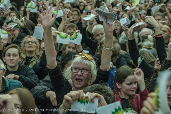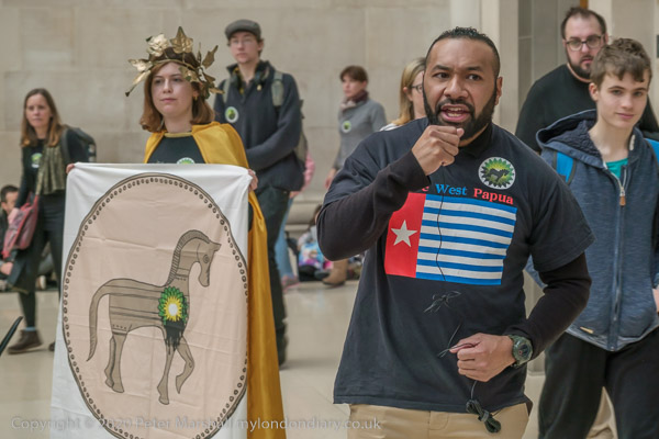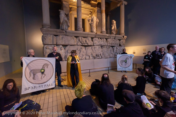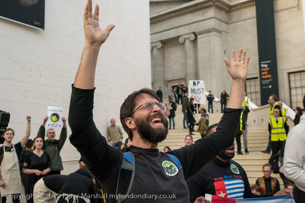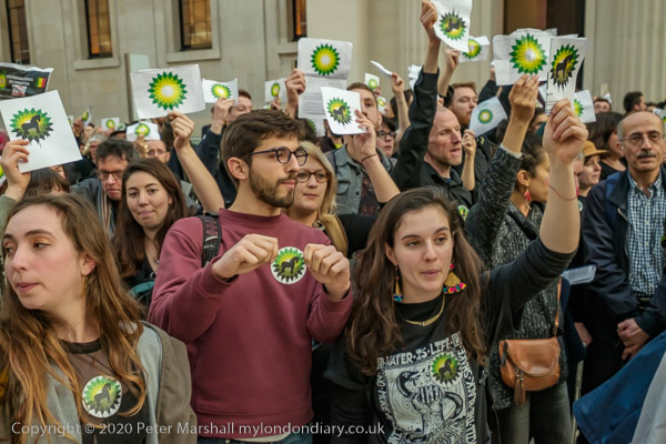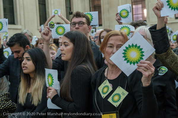 Finally, the protesters fill the Great Hall and hold up BP logos