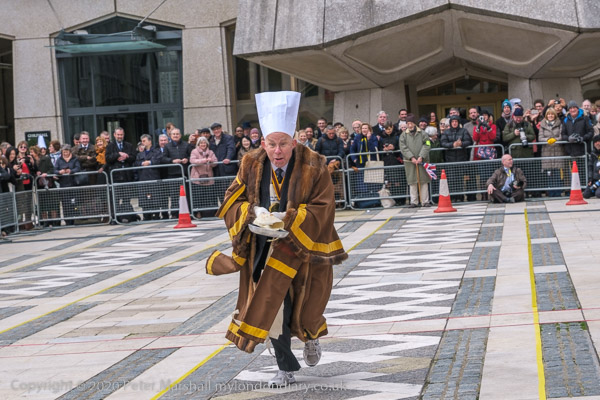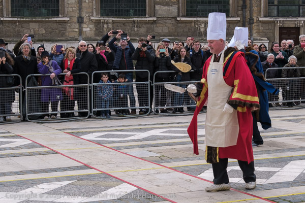 The contestants have to toss the pancake going down the yard and on