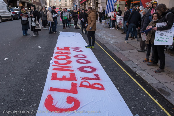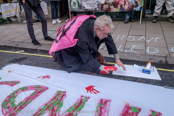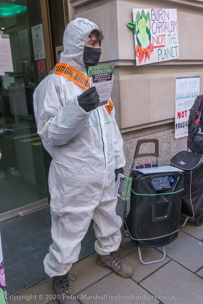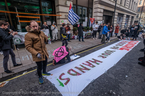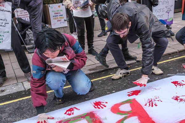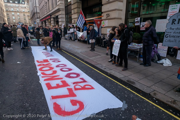 A man starts painting the slogan 'GLENCORE BLOOD ON YOUR HANDS' on